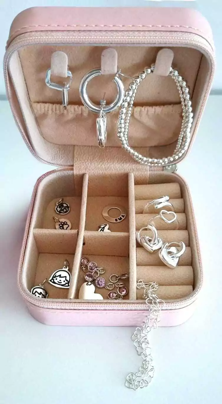 Alhajero organizador de joyas color rosa pastel, con divisiones para guardar tus anillos, dijes, medallas, aros y cadenas. Con cierre.
