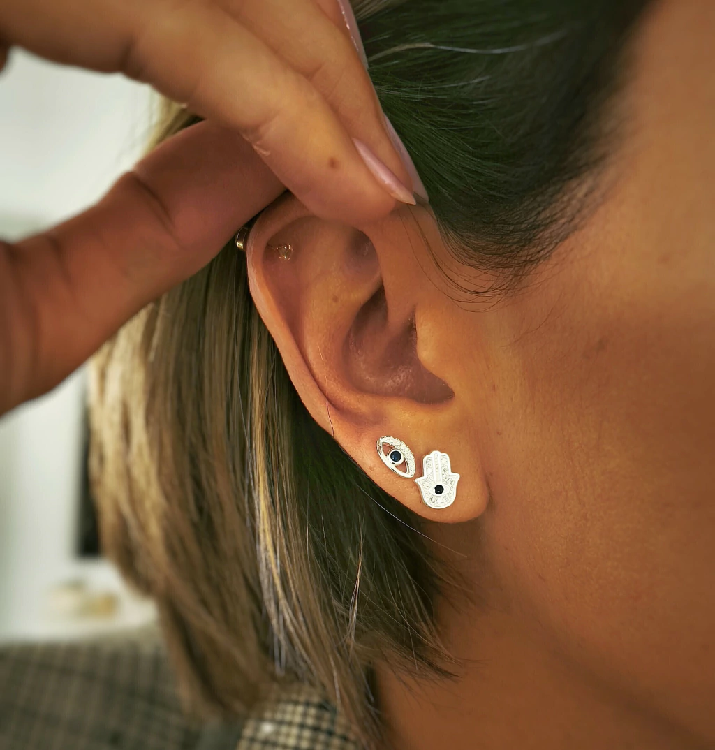 Aros pasante en plata 925 con piedras cubik blancas y azul en forma ojitos turcos, hacen uego con la pulsera KARIM.