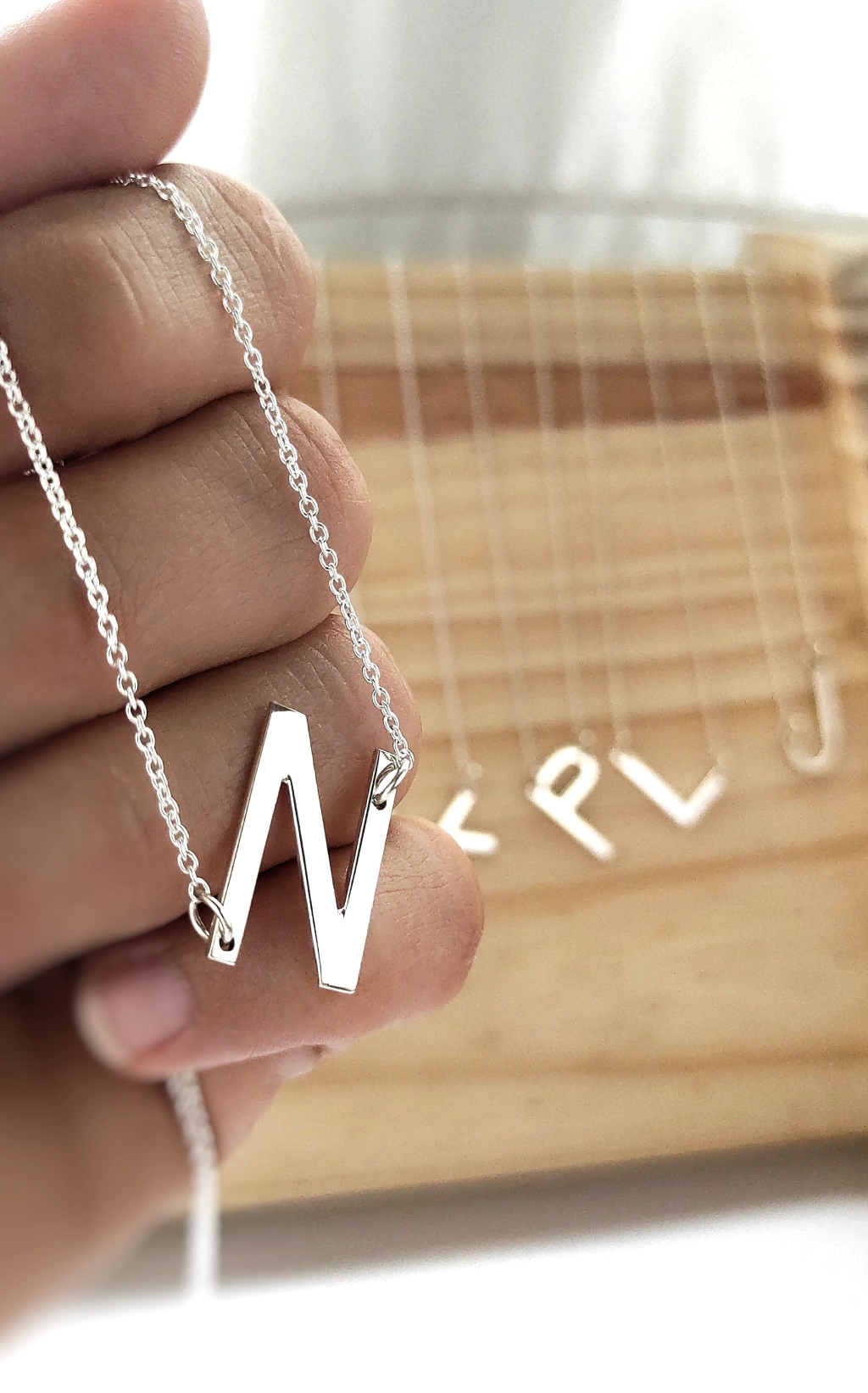 Collar de plata 925 con inicial. Las iniciales cualgan de costado segun su forma.