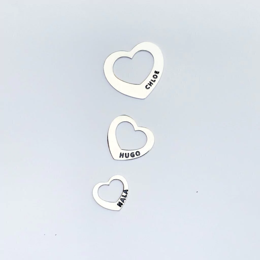 Medalla calada de plata con forma de corazón para perzonalizar. Es ideal para llevar con cadenas o pulseras, de a una o varias juntas y podés combinarlas en diferentes tamaños.
